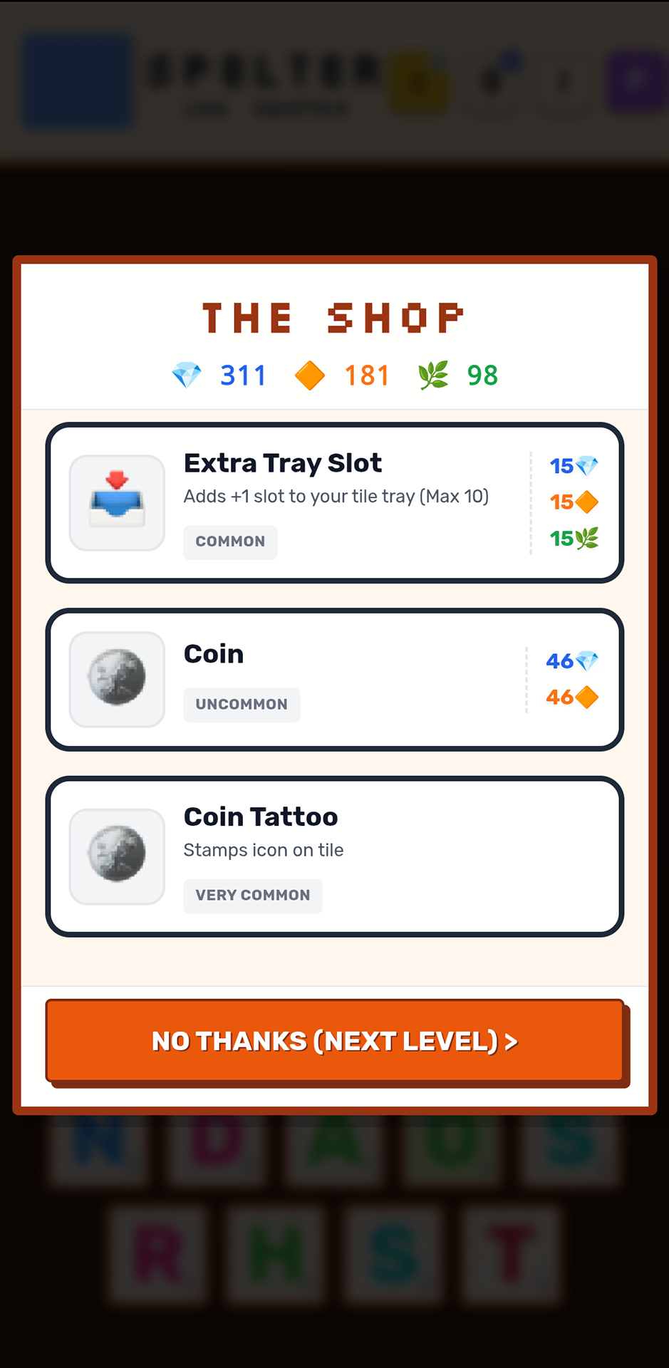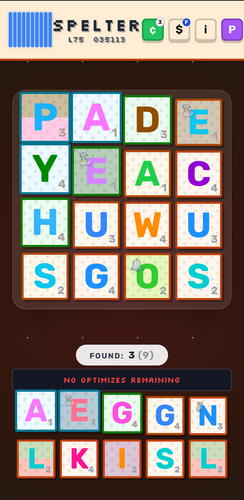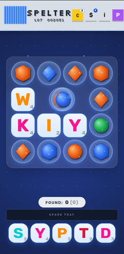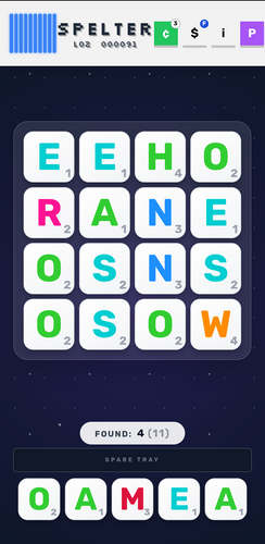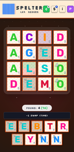 In Spelter, you swap, optimize, and refresh boarded and spare tiles to clear the board quickly and collect as many uncracked gems as possible. You then use these gems to buy skins, tattoos, and prysms to make everything look better. It may take you quite a while to get used to the dictionary if you're used to wordmakers.